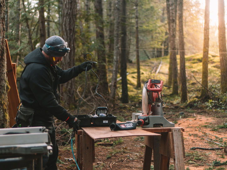 This 900 sq ft post and beam cabin bend around two large fir trees and is built to preserve the root systems to those trees. A shady green roof was planted with the help from neighbours who selectively harvested moss and other native plant form their properties to share with them.