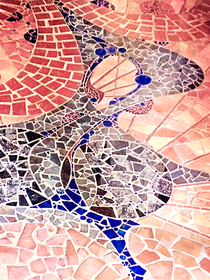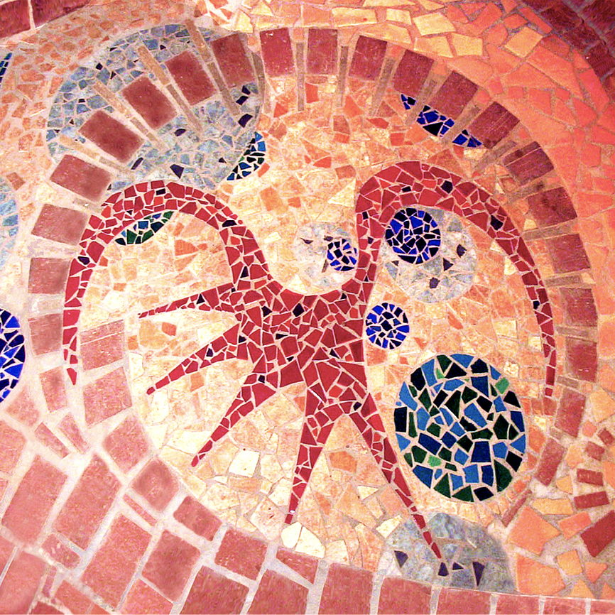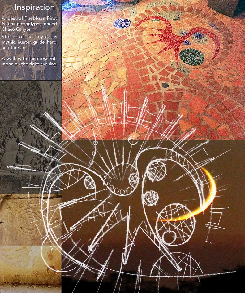 Recycled brick pavers and salvaged ceramic tiles are used to create organic floor mosaics. A stained glass prism shaped inhabitable kaleidoscope can be climbed up into to look out onto the desert landscape.
